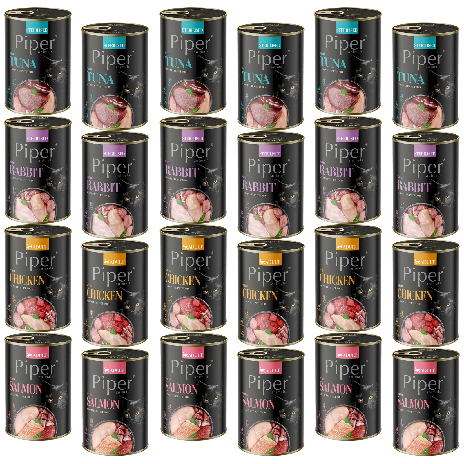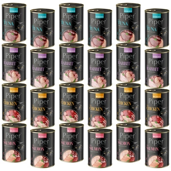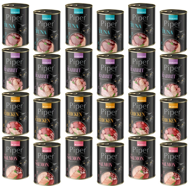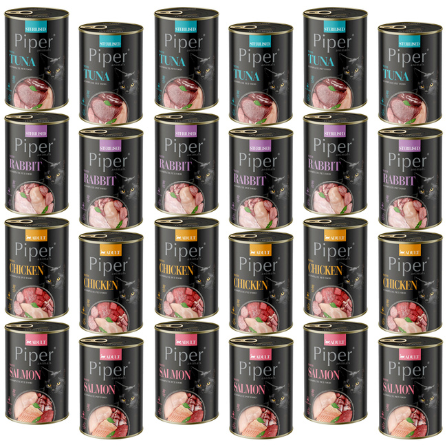 PIPER Dolina Noteci Mix Smaków to pełnoporcjowa, bezzbożowa karma mokra dla kotów, oferująca różnorodność smaków w jednym zestawie. Wysoka zawartość mięsa i podrobów zapewnia wartościowe białko oraz niezbędne składniki odżywcze, które wspierają zdrowie kota, jego odporność oraz kondycję skóry i sierści. Idealna dla kotów wybrednych oraz tych, które potrzebują urozmaiconej diety.