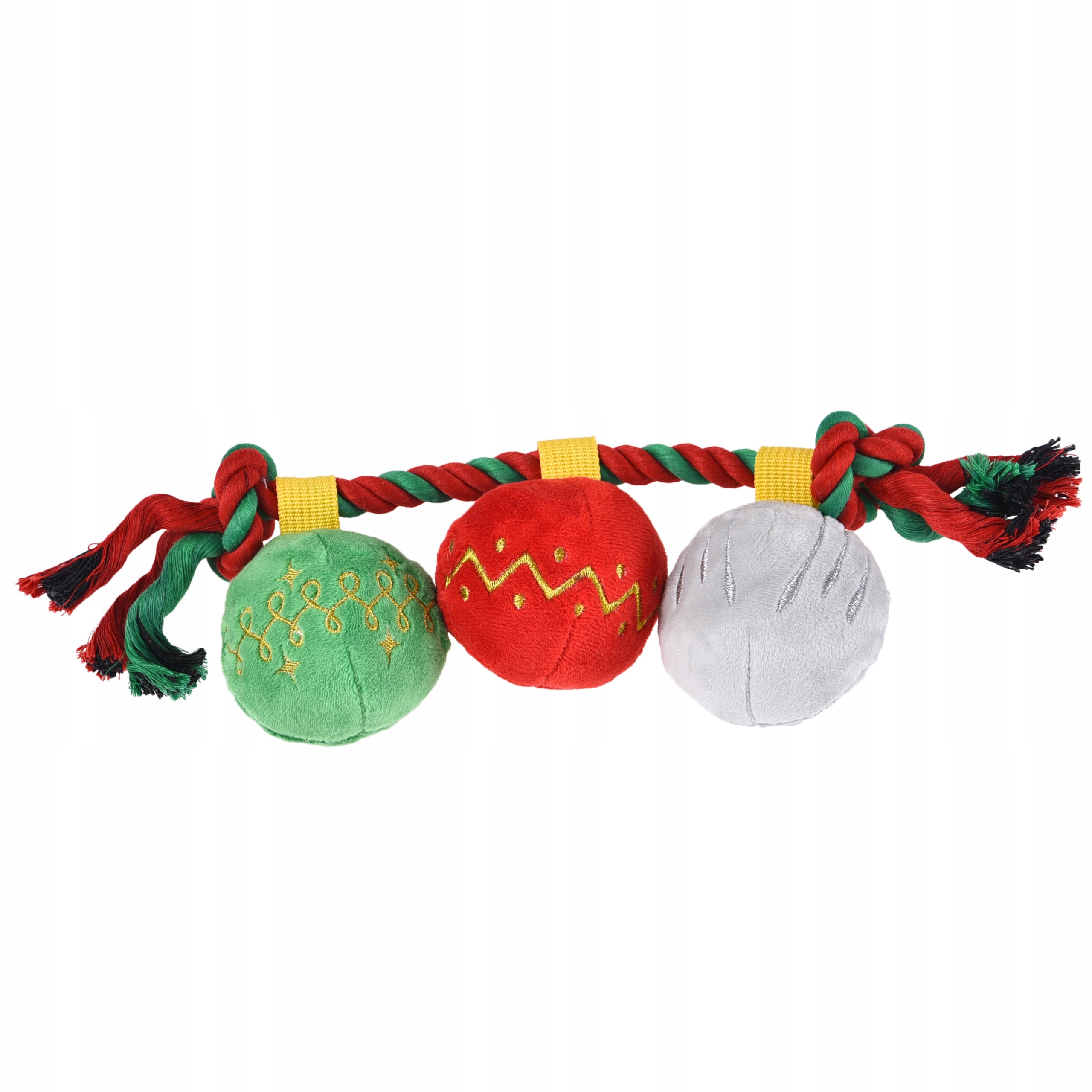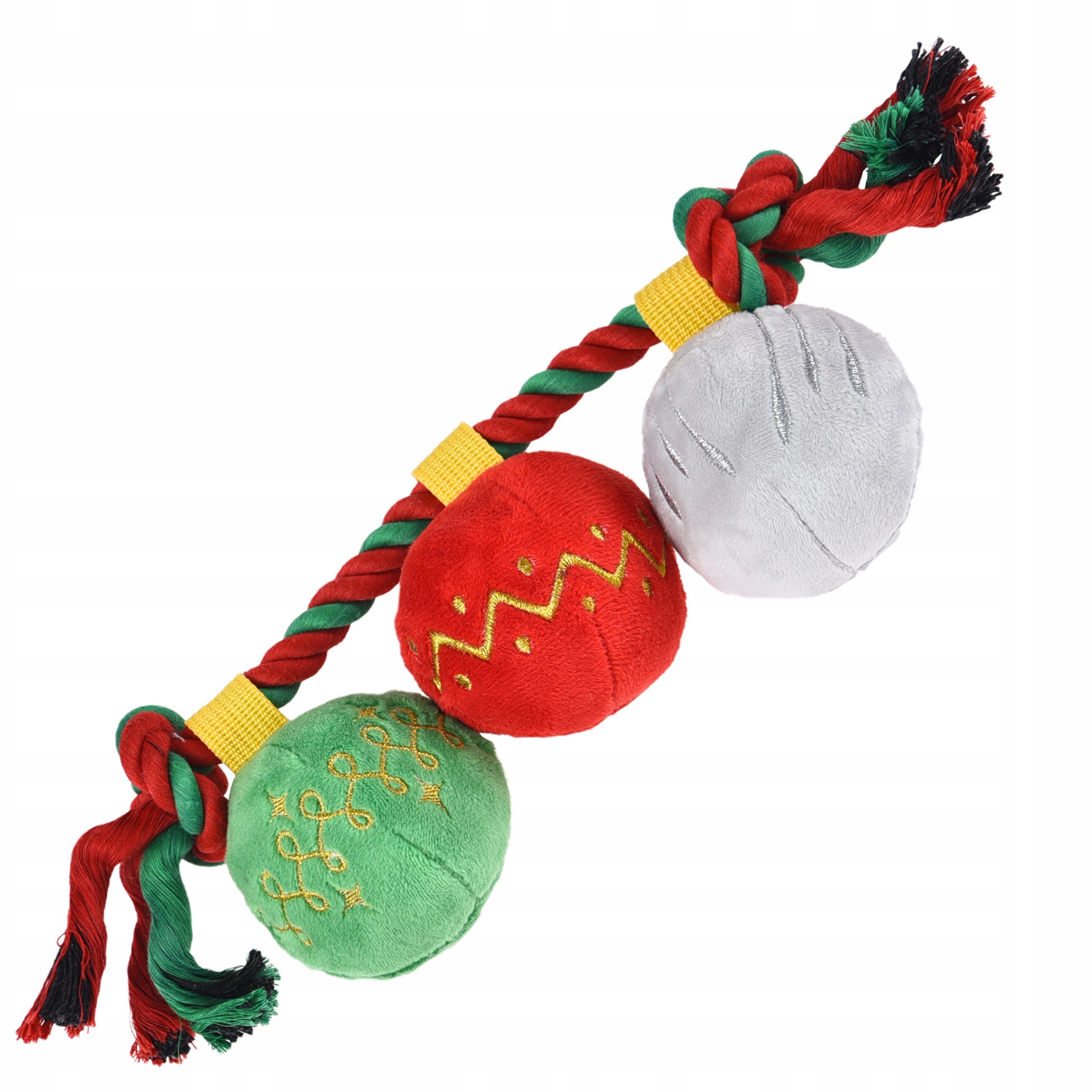 ⭐️ Trzy przyjazne, pluszowe piłeczki w barwach zieleni, czerwieni i szarości zostały zawieszone na mocnym sznurze, co daje psiakowi możliwość przeciągania, aportowania i noszenia zabawki.