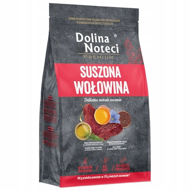 DOLINA NOTECI Premium suszona karma dla kota z wołowiną to pełnoporcjowy posiłek o wyjątkowo wysokiej zawartości mięsa. Dzięki nowoczesnemu procesowi suszenia karma zachowuje naturalny smak i wartości odżywcze świeżych składników, jednocześnie pozostając lekkostrawna i aromatyczna. To idealne rozwiązanie dla opiekunów, którzy chcą zapewnić swojemu kotu codzienną dietę bliską naturalnym potrzebom żywieniowym.