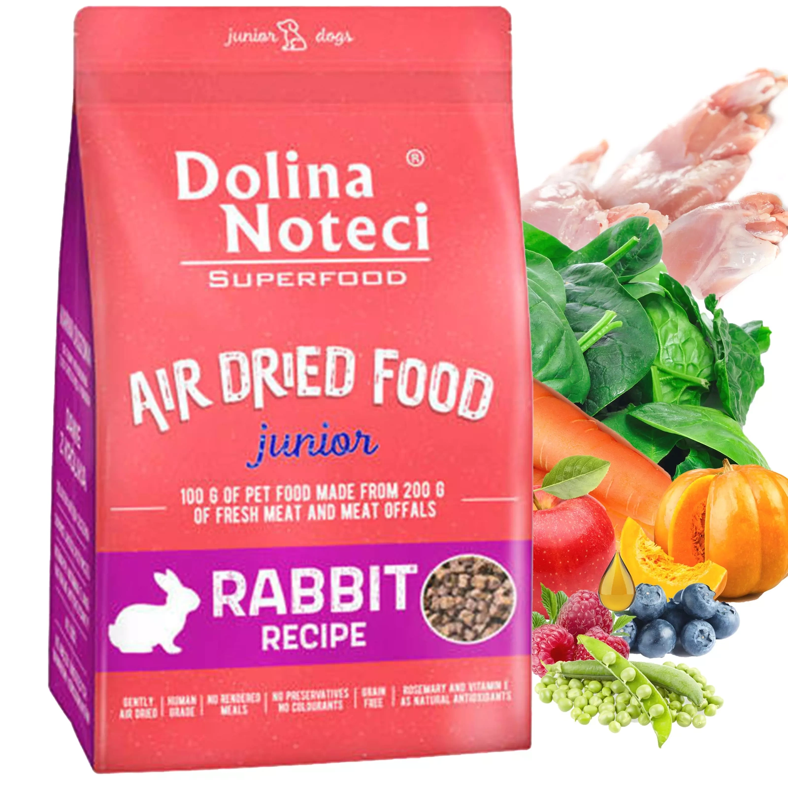 Dolina Noteci Superfood Junior Królik to pełnoporcjowa, bezzbożowa karma sucha dla szczeniąt, stworzona z myślą o prawidłowym rozwoju i zdrowiu młodych psów. Wysoka zawartość mięsa królika dostarcza lekkostrawnego białka, bogatego w aminokwasy i minerały. Dodatek superfoods, takich jak siemię lniane, owoce i zioła, wzmacnia odporność i wspiera trawienie.