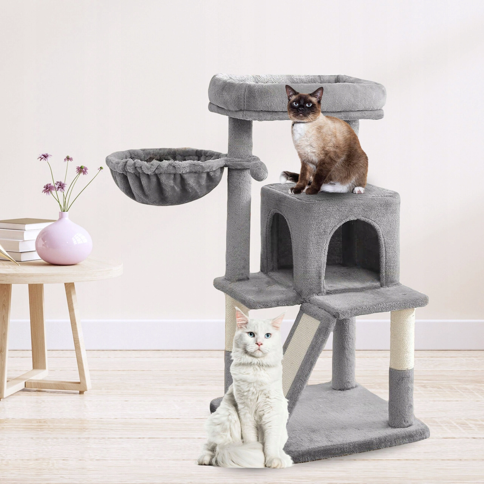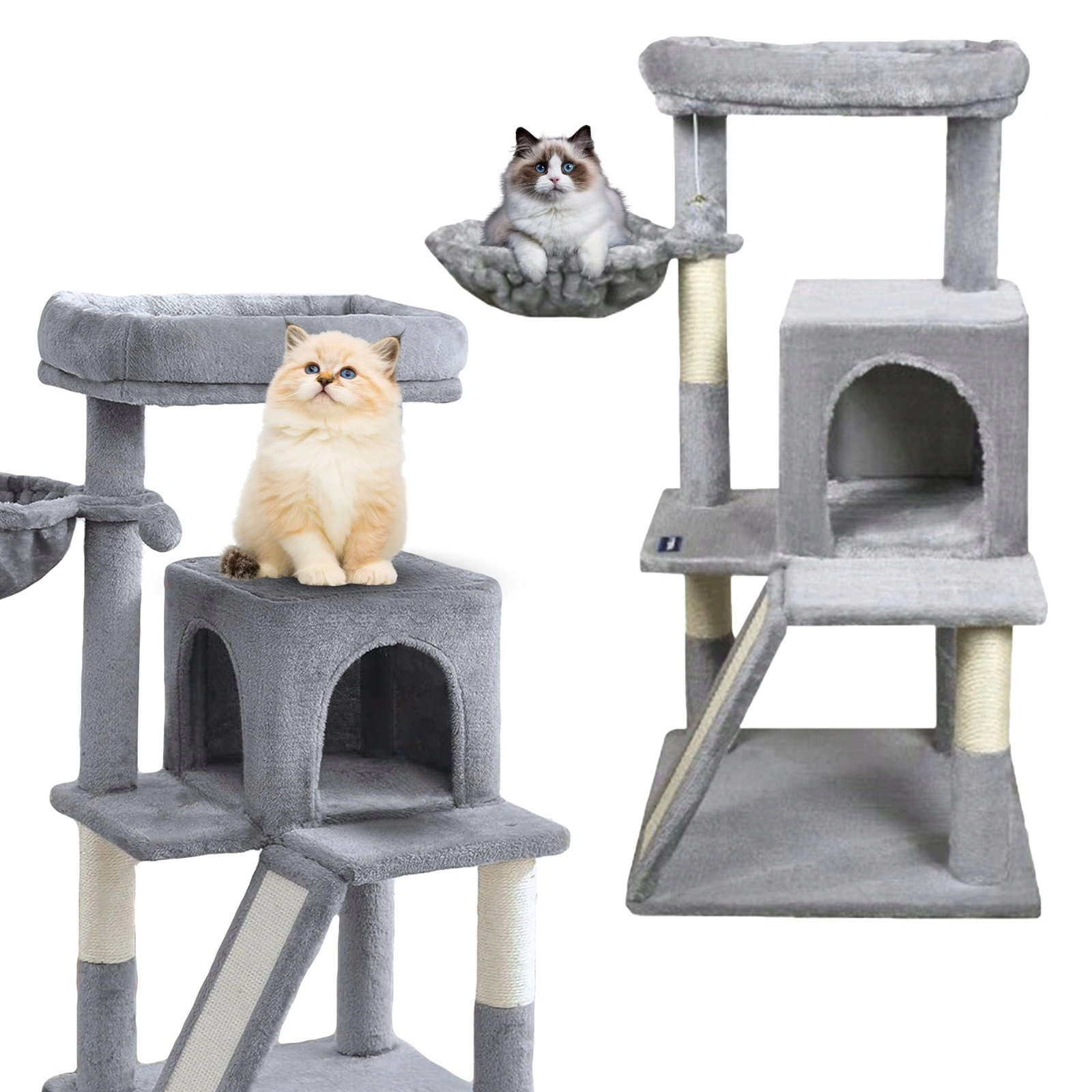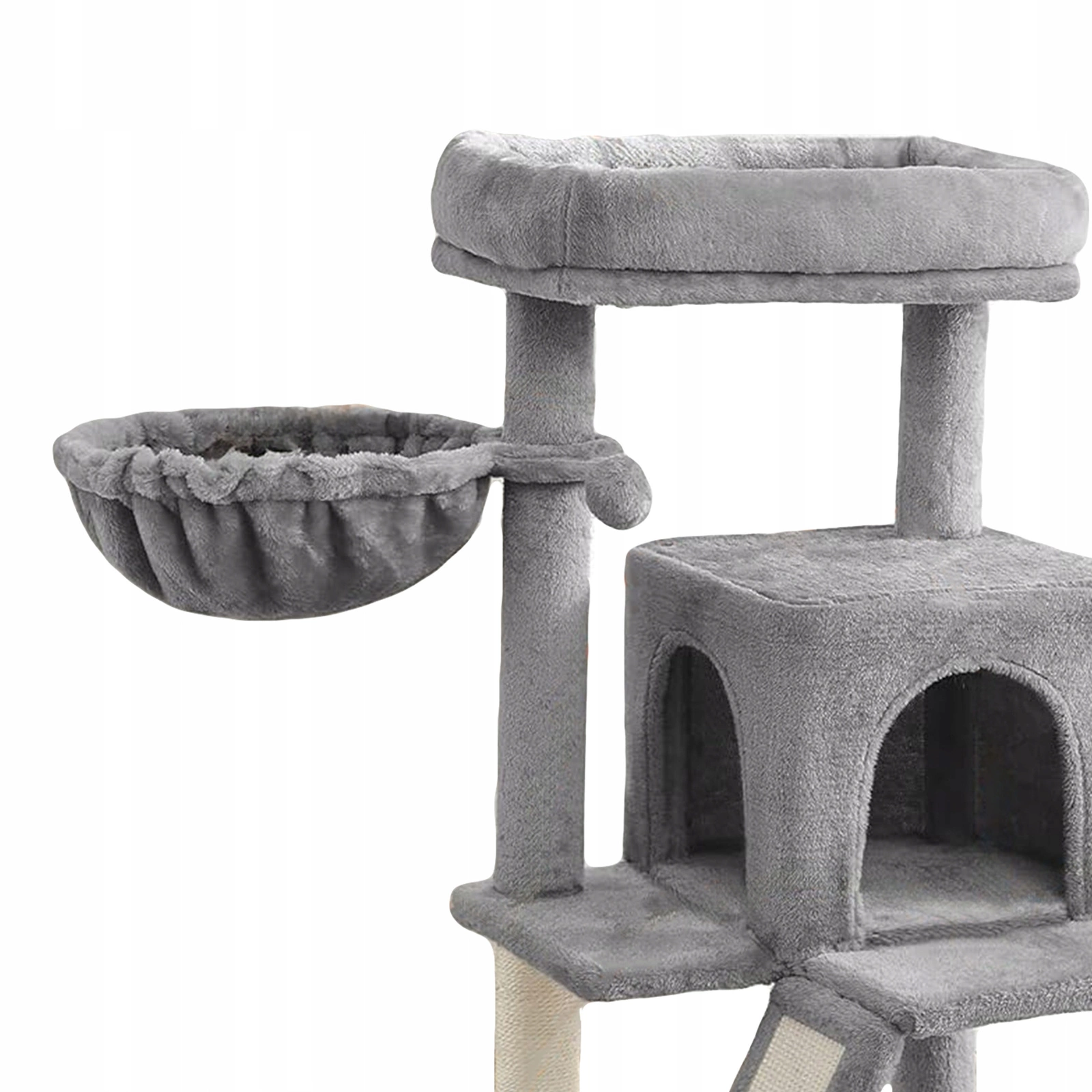 - Skośna rampa z powierzchnią sizalową – dodatkowa strefa do drapania i wspinania