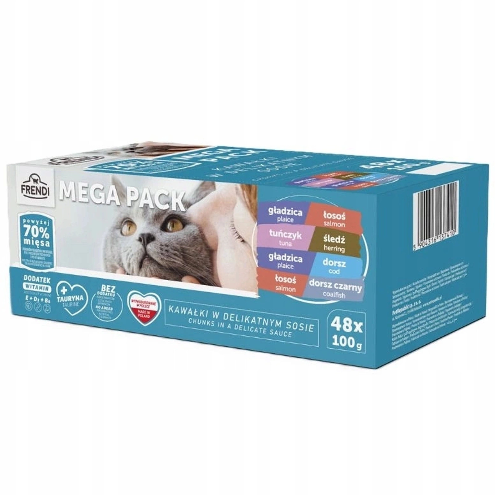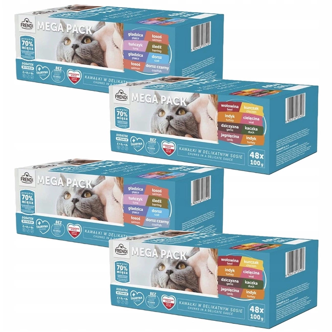 FRENDI Kawałki w sosie karma mokra dla kota mix smaków to duży zestaw 192 saszetek po 100g, który oferuje kotu różnorodność smaków w delikatnym sosie. Każda saszetka zawiera kawałki mięsa, które dostarczają kotu białka oraz niezbędnych składników odżywczych, wspierając jego zdrowie, witalność i kondycję.