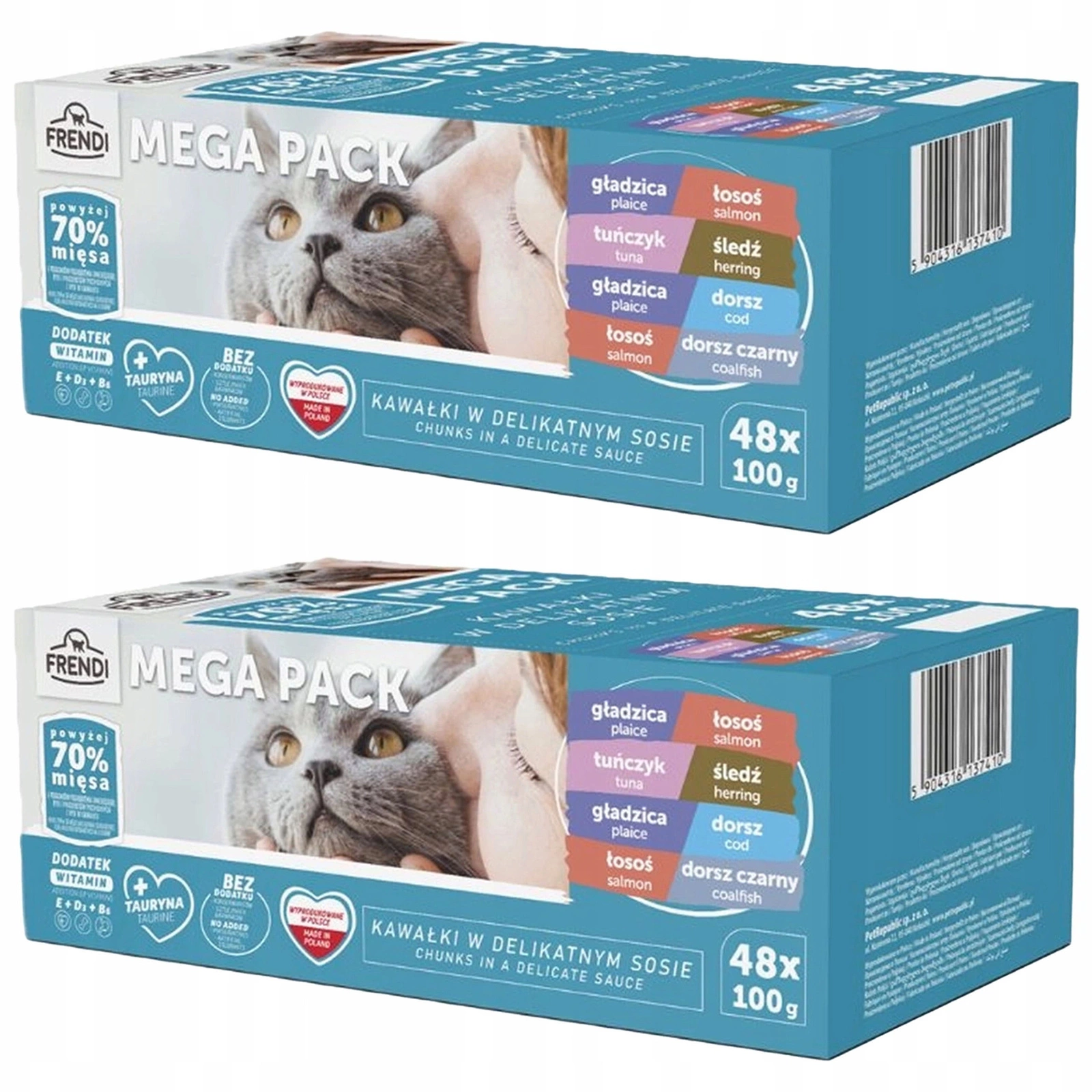 FRENDI Kawałki w sosie karma mokra dla kota w rybnych smakach to zestaw 48 saszetek po 100g, które dostarczają kotu pyszne kawałki ryb w aromatycznym sosie. Karma zapewnia zbilansowane odżywianie, dostarczając kotu niezbędnych białek, witamin i minerałów.