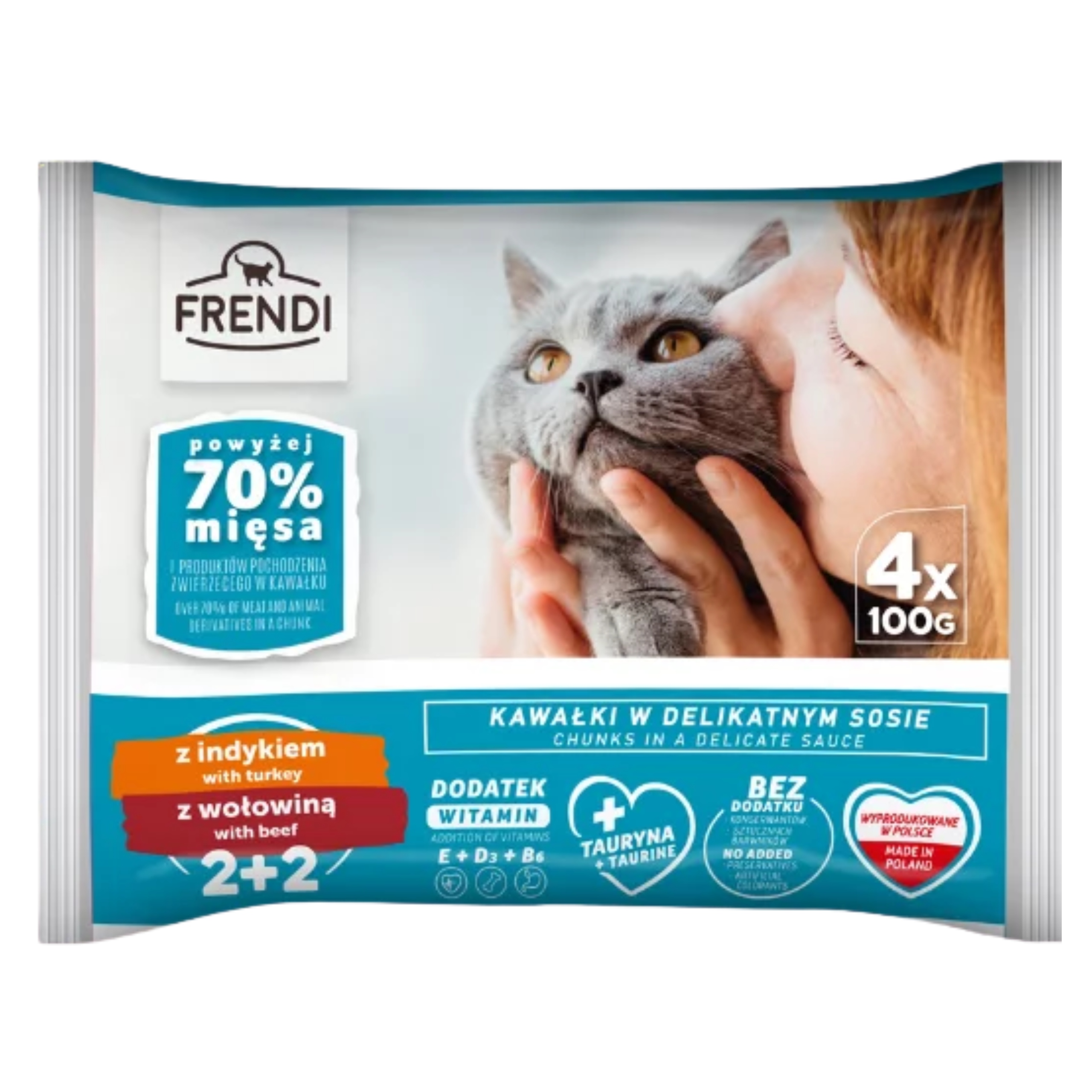 ⭐️FRENDI 4 × 100 g to kompletna mokra karma dla dorosłych kotów wszystkich ras. W opakowaniu znajdziesz cztery saszetki — 2 z kawałkami indyka i 2 z kawałkami wołowiny — zanurzone w delikatnym sosie.