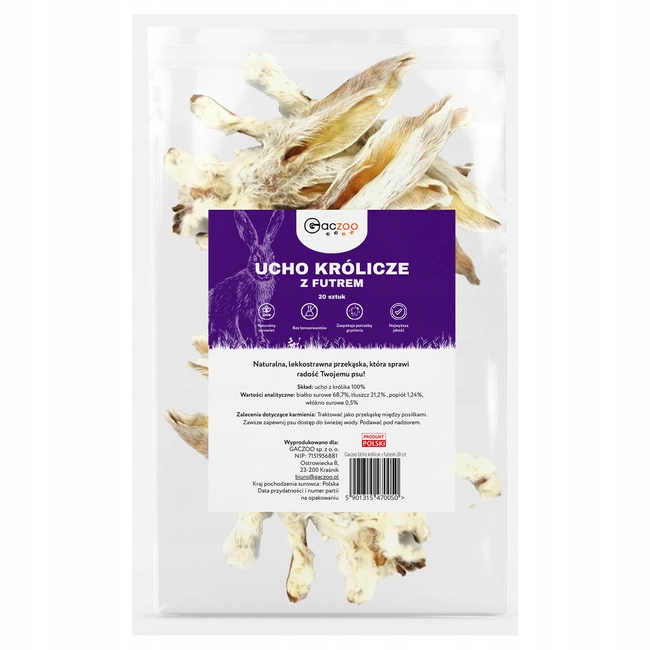 GACZOO Ucho Królicze z futrem to wyjątkowy, w 100% naturalny przysmak, który nie tylko dostarcza psu przyjemności z gryzienia, ale również wspiera oczyszczanie przewodu pokarmowego. Delikatne, suszone uszy królika z pozostawionym futrem to naturalna przekąska inspirowana dietą przodków psa.
