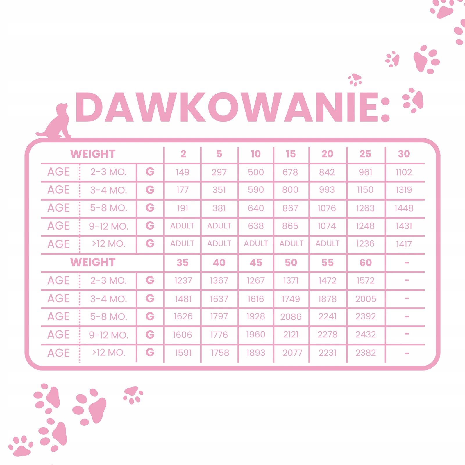W tabelce znajduje się sugerowana ilość karmy dostosowana do wagi i potrzeb Twojego pupila.