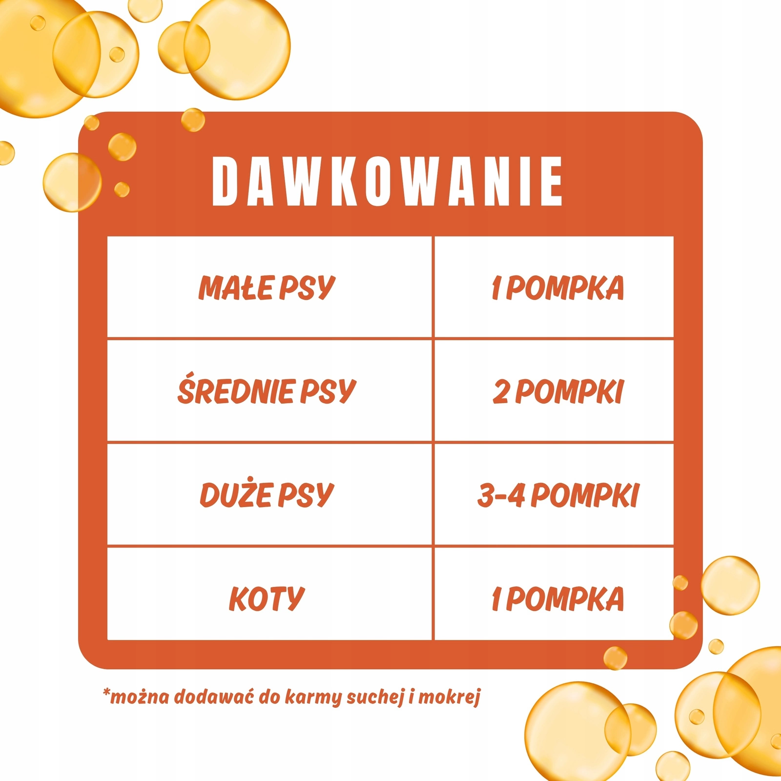 • Poprawa kondycji sierści i skóry – redukuje łupież, swędzenie i matowienie sierści.
