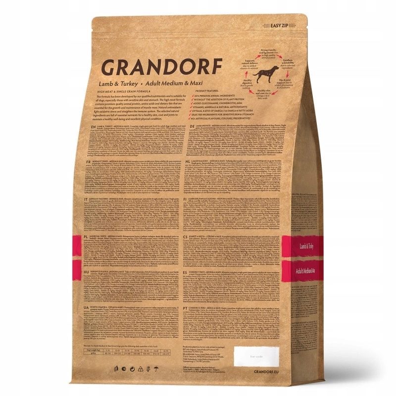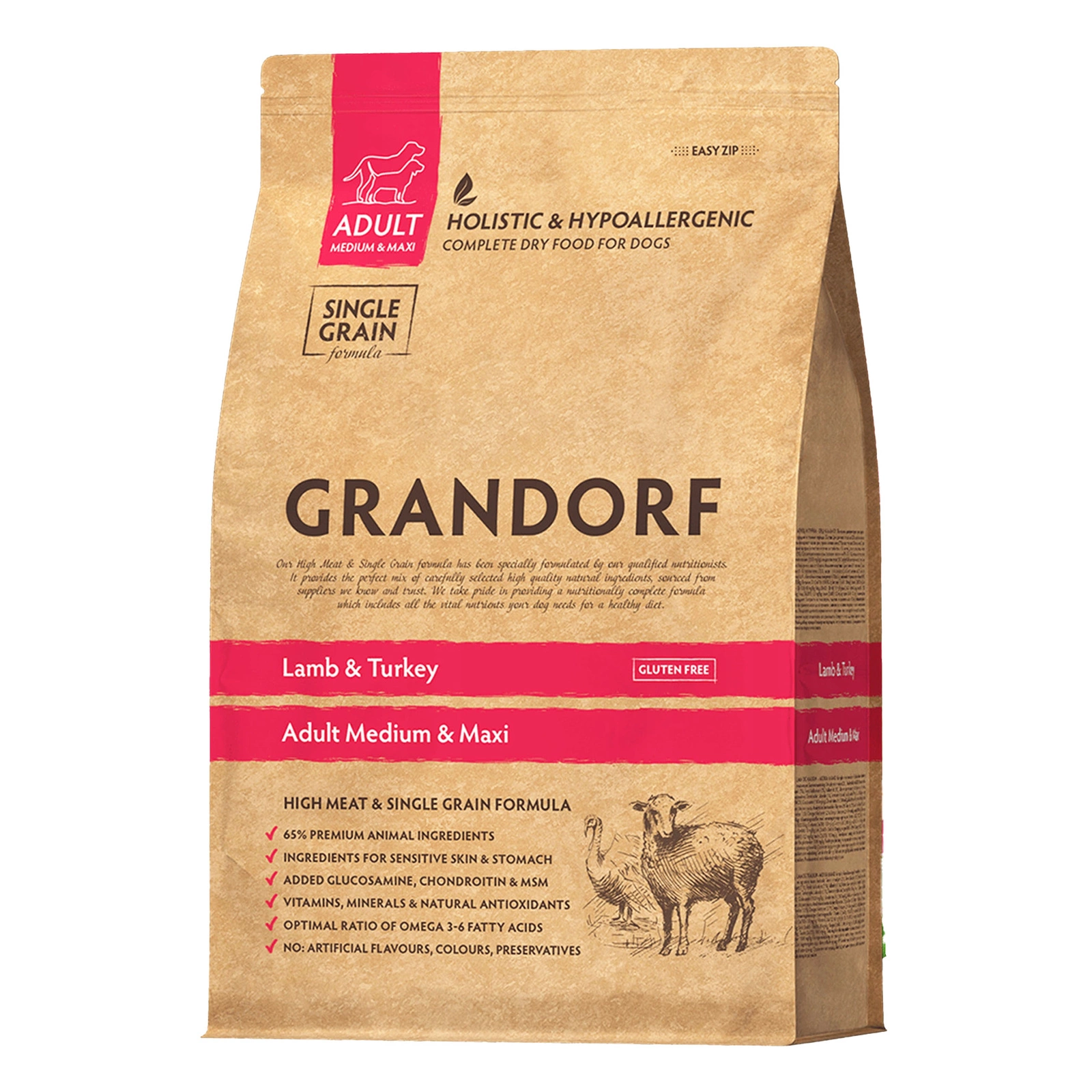 GRANDORF DOG MEDIUM & MAXI ADULT z jagnięciną i indykiem to wysokiej jakości sucha karma stworzona specjalnie dla dorosłych psów ras średnich i dużych. Receptura oparta na lekkostrawnym mięsie jagnięcym i indyczym zapewnia doskonałą przyswajalność oraz wsparcie dla układu trawiennego, odporności i zdrowych stawów.