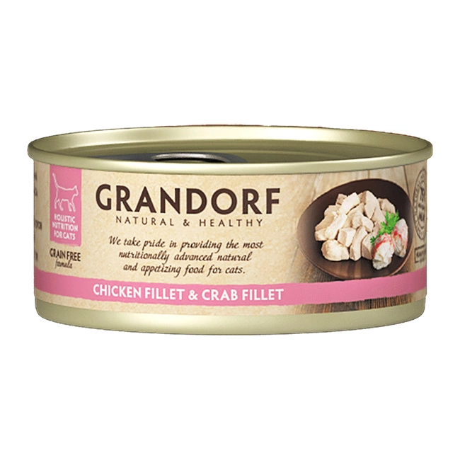 GRANDORF Zdrowa Karma mokra dla kota Kurczak i Krab 70 g to bezzbożowa, pełnowartościowa karma mokra przeznaczona dla dorosłych kotów. Połączenie delikatnego mięsa z kurczaka i wykwintnego kraba zapewnia wysoką smakowitość oraz wartościowe białko, idealne dla kotów z wrażliwym układem pokarmowym.