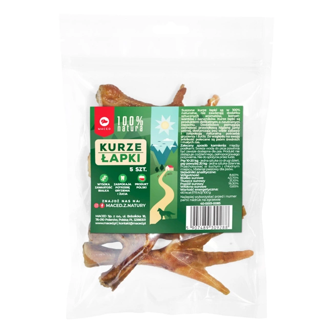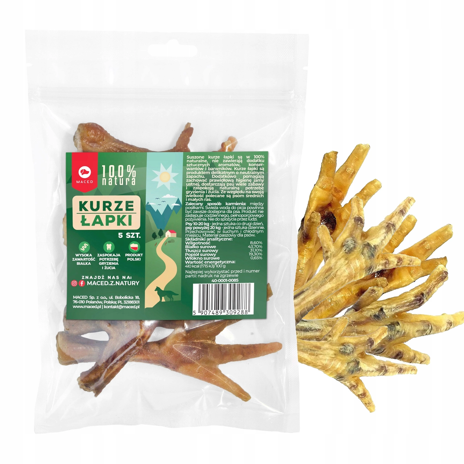 Pozbawione pazurów kurze łapki są świetnym gryzakiem dla psów. Niska zawartość tłuszczu i wysoka zawartość włókien powodują, że jest to doskonała przekąska dla psów z nadwagą lub tendencją do tycia. Stymulują ukrwienie dziąseł i czyszczą zęby.