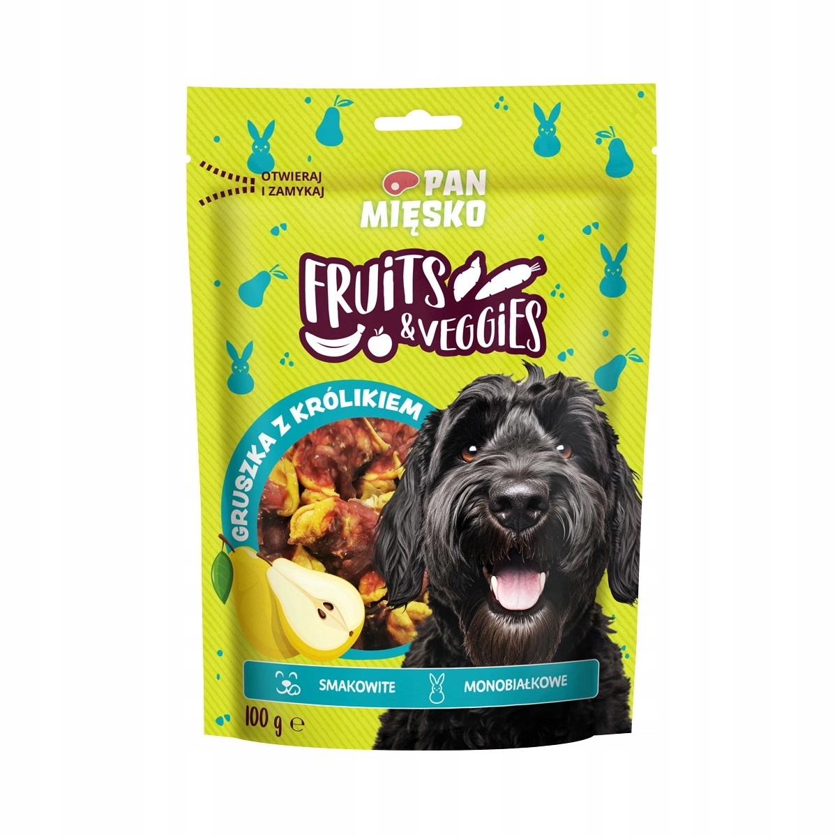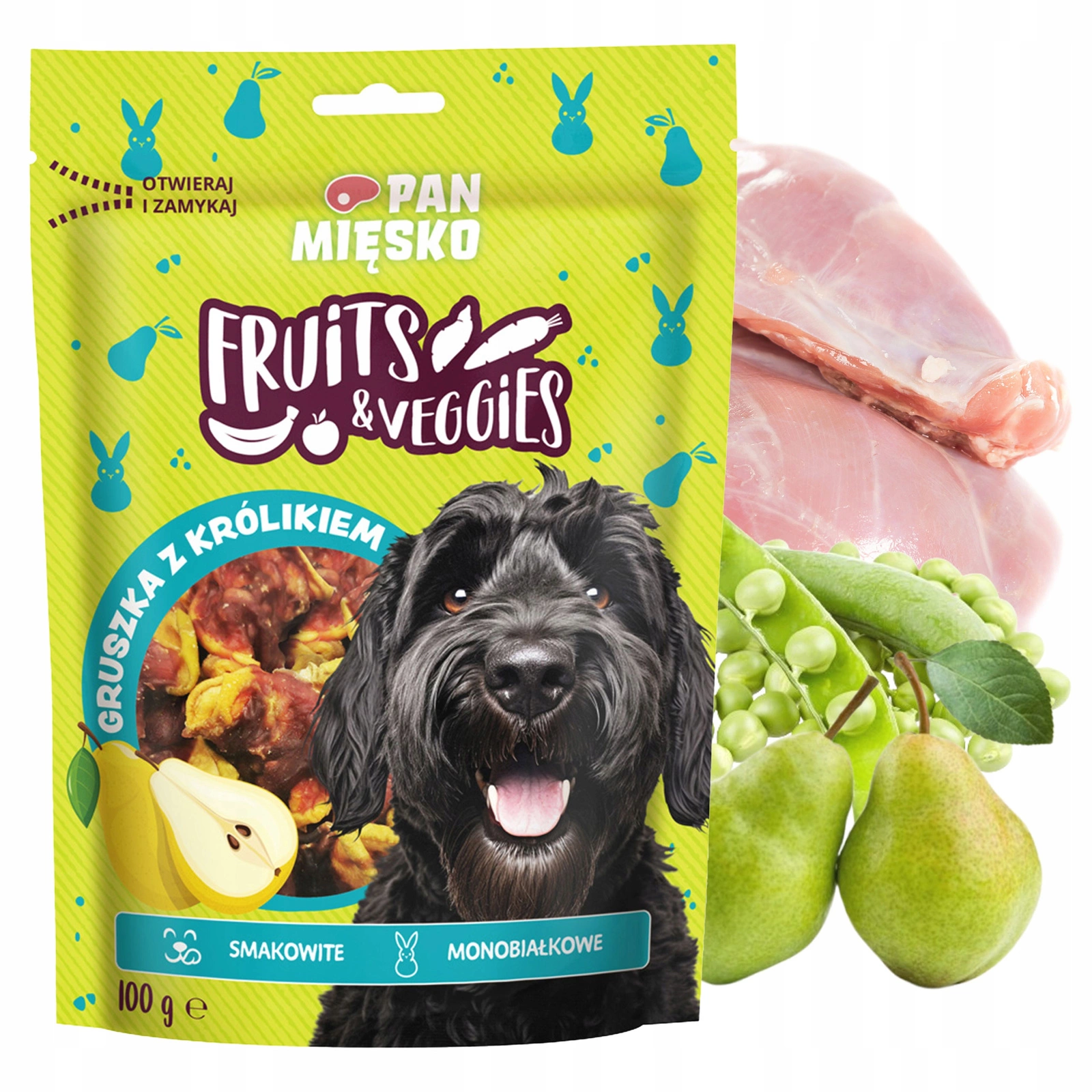 Pan Mięsko Fruits & Veggies Gruszka z Królikiem to zdrowy przysmak dla psów, który łączy mięso królika z gruszką. To doskonała przekąska, pełna witamin i minerałów, wspierająca zdrowie psa i dostarczająca wyjątkowych doznań smakowych.