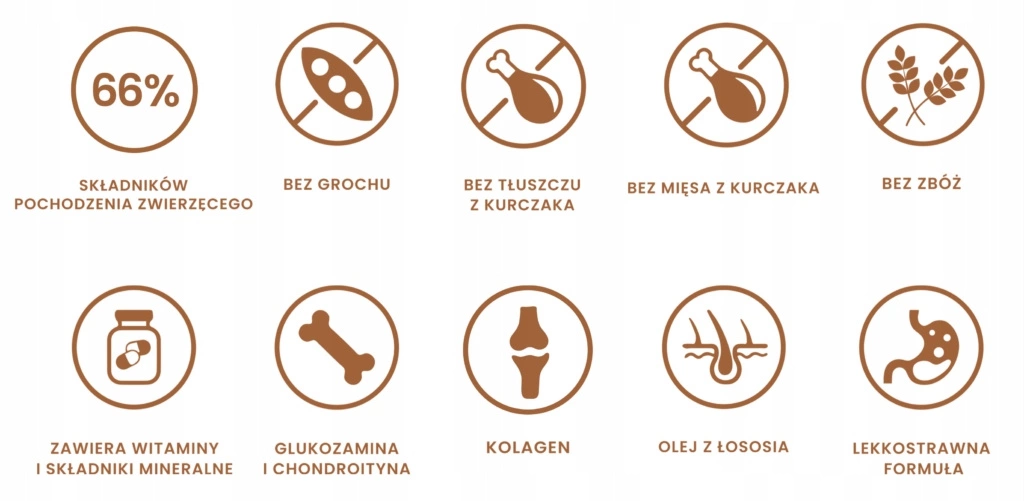 Skład: Wołowina (51 %, w tym 36 % wołowina suszona, 15 % wołowina świeża), bataty (15 %), tłuszcz wołowy (10 %), wątroba z wieprzowiny hydrolizowana (4 %), marchew suszona (4 %), suszone jabłko (4 %), wysłodki buraczane suszone (z buraków cukrowych), siemię lniane (3 %), składniki mineralne, gruszka suszona (3 %), olej z łososia (1 %), cykoria suszona (0,5 %), drożdże piwne suszone, MOS (manno-oligosacharydy) (0,5 %), żurawina suszona (0,3 %), glukozamina (600 mg/kg), siarczan chondroityny (600 mg /kg), brokuły suszone, pomidory suszone, borówki suszone, ekstrakty roślinne (Jukka Mojave (0,05 %), Rosmarinus sp., Curcuma sp., Citrus sp.), hydrolizowany kolagen (0,1 %).