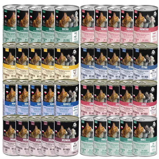 • Zróżnicowane smaki – mix smaków, takich jak pstrąg, kaczka, krewetki, stanowi atrakcyjną opcję dla kotów, które lubią urozmaiconą dietę