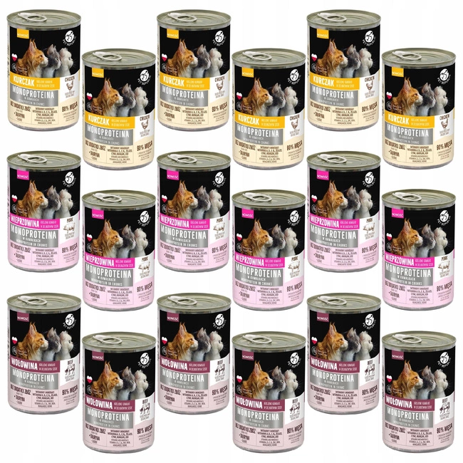 ⭐️ Monobiałkowa receptura – w każdej puszce tylko jedno źródło białka (kurczak, wieprzowina lub wołowina).