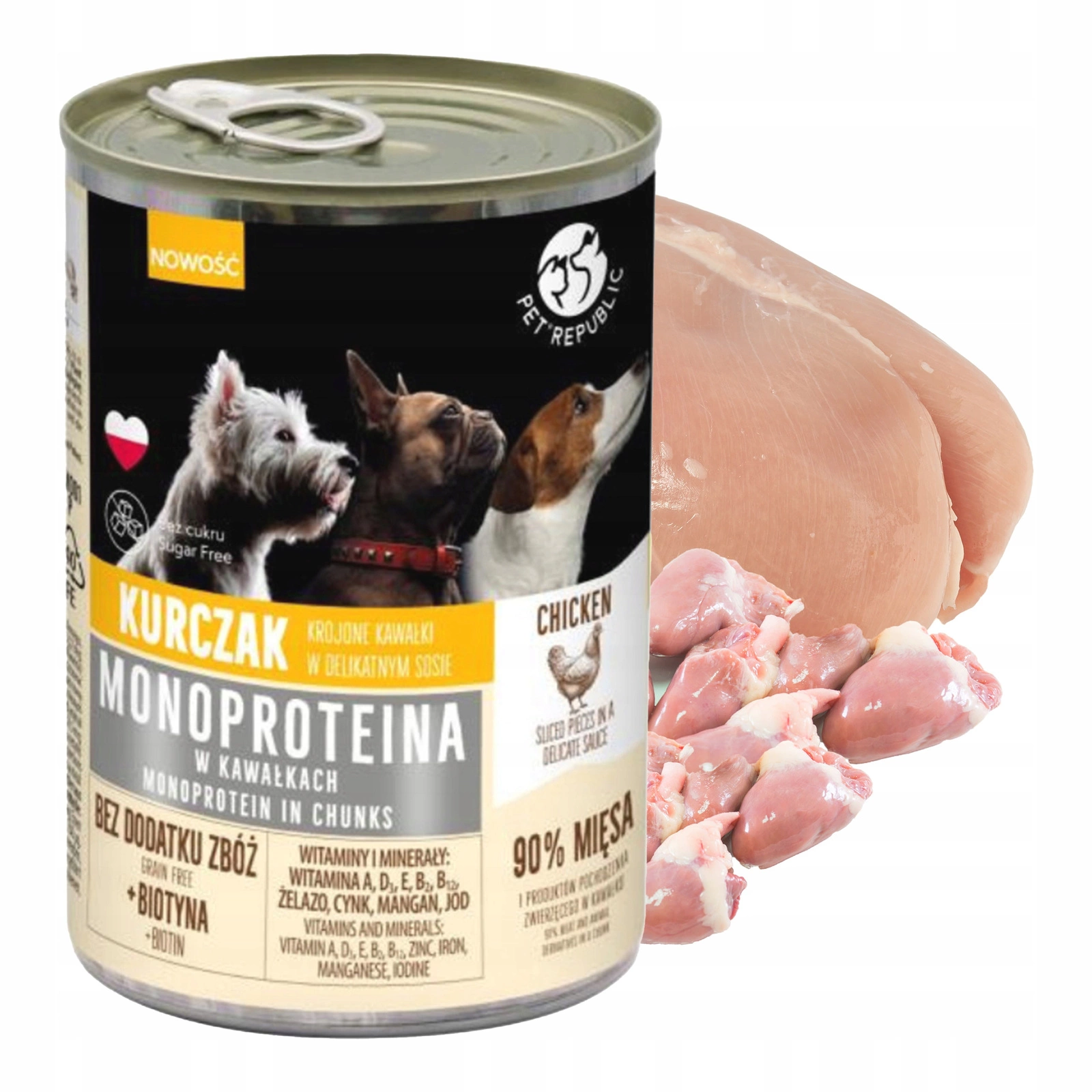 PET REPUBLIC Mono Protein Mix Smaków karma dla psa mokra 400 g to pełnoporcjowa mokra karma monobiałkowa, przeznaczona dla dorosłych psów wszystkich ras. Każda puszka zawiera jedno źródło wysokiej jakości białka zwierzęcego, co jest idealne dla psów z wrażliwością pokarmową lub alergiami. Dostępne smaki obejmują kurczaka, wołowinę i wieprzowinę.