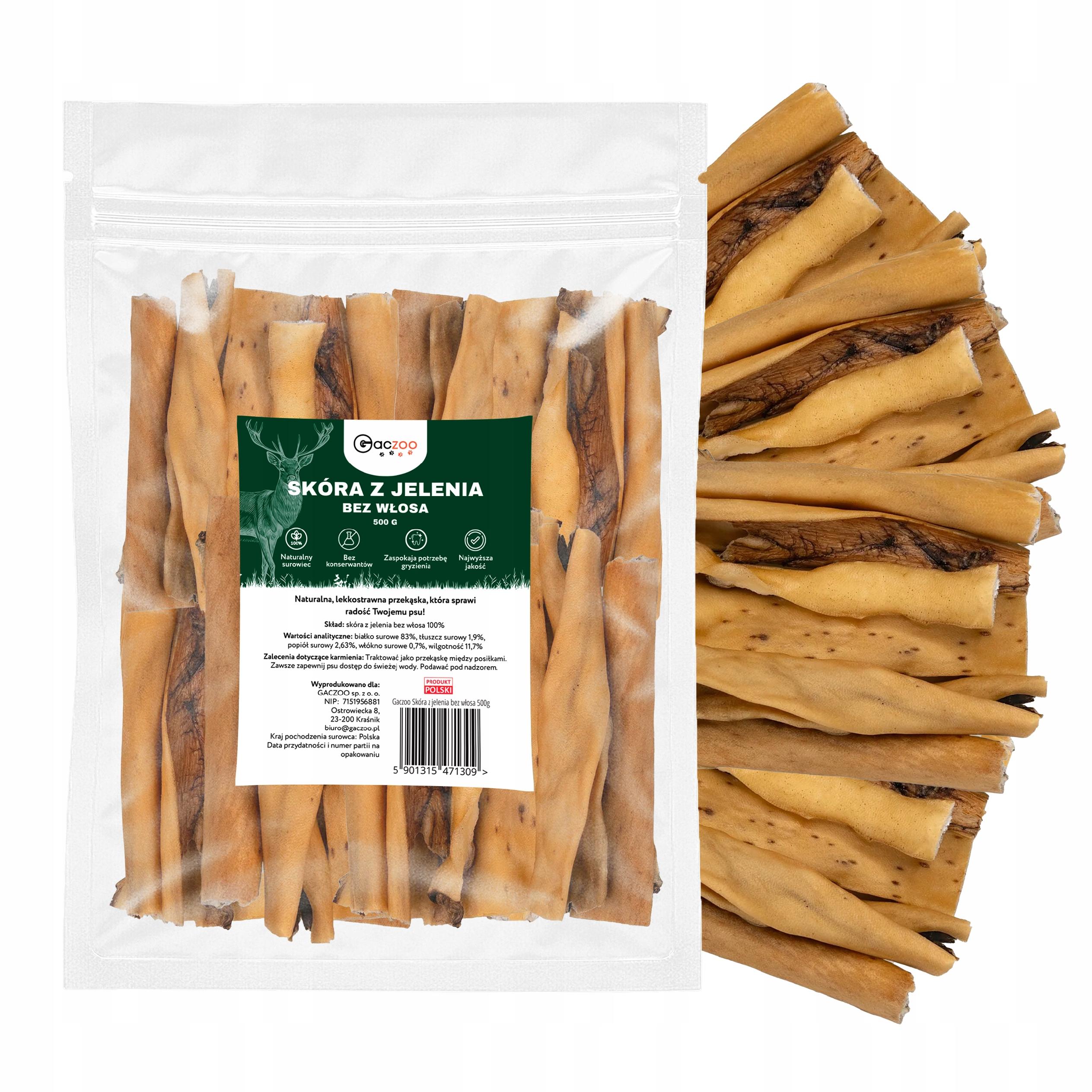 Przysmak dla psa Skóra z jelenia bez włosa 500g GACZOO naturalny gryzak