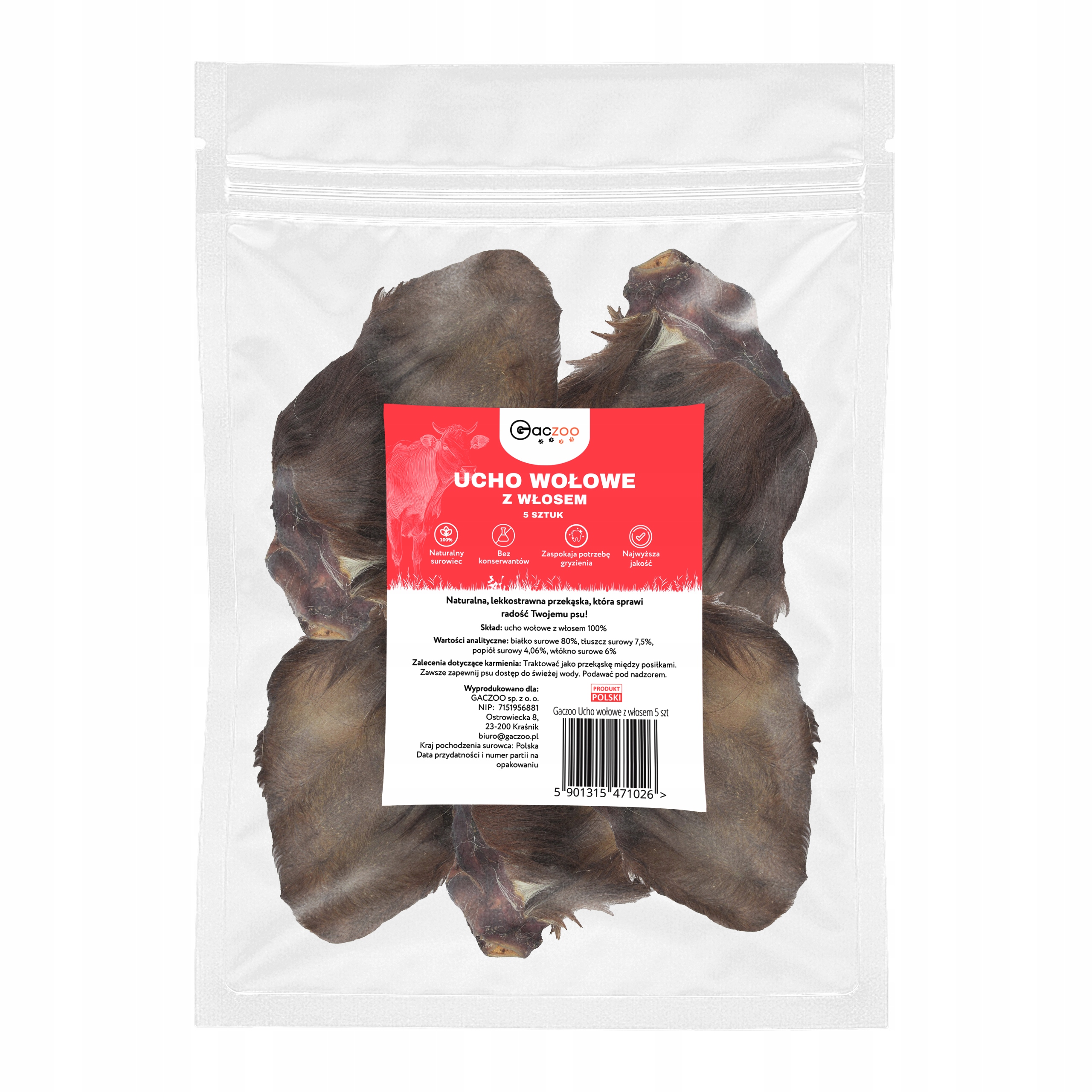 ✅ GACZOO Przysmak dla psa Ucho Wołowe z włosem – Zdrowy i Naturalny Gryzak