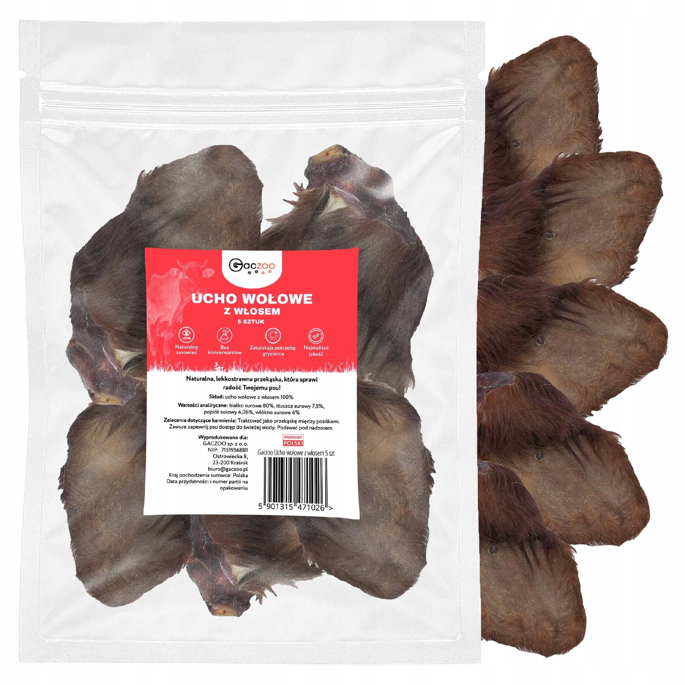 Przysmak dla psa Ucho Wołowe z włosem 5 szt GACZOO naturalny gryzak