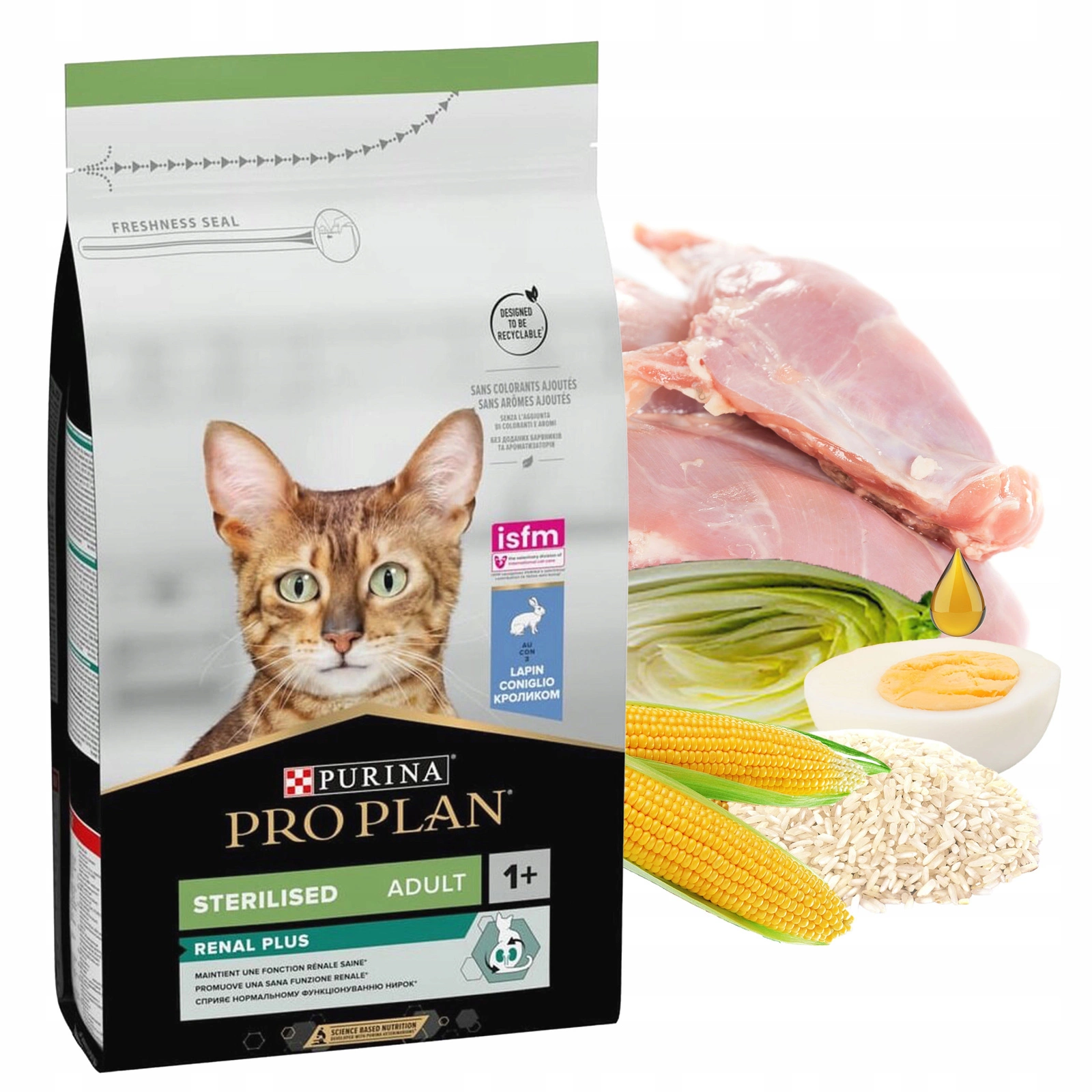 Wysokiej jakości kurczak (19% w tym grzbiet i pierś), suszone białko drobiowe, ryż, mączka z białka kukurydzianego, gluten pszenny, pszenica, mąka pszenna, wysokiej jakości królik (4% w tym pierś), celuloza, kukurydza, suszone jaja, składniki mineralne , olej rybi, tłuszcz zwierzęcy, hydrolizat białkowy, drożdże.
