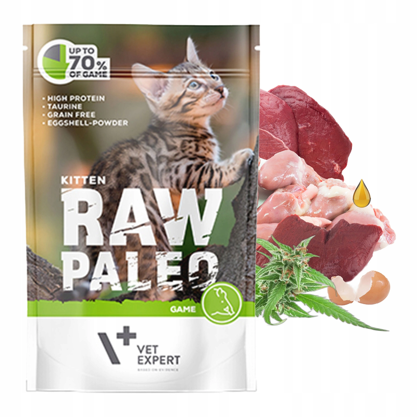 RAW PALEO Kitten Mix Smaków to pełnoporcjowa, bezzbożowa mokra karma dla kociąt od momentu odstawienia aż do ukończenia 1. roku życia. Wysoka zawartość mięsa wspiera intensywny rozwój i odporność młodego organizmu.
