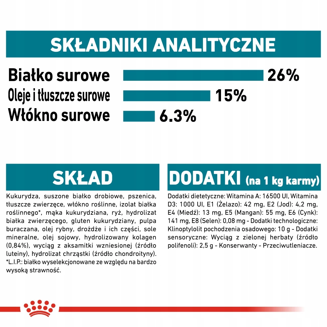 kukurydza, suszone białko drobiowe, pszenica, tłuszcze zwierzęce, włókno roślinne, izolat białka roślinnego*, mąka kukurydziana, ryż, hydrolizat białka zwierzęcego, gluten kukurydziany, pulpa buraczana, olej rybny, drożdże i ich części, sole mineralne, olej sojowy, hydrolizowany kolagen (0,84%), wyciąg z aksamitki wzniesionej (źródło luteiny), hydrolizat chrząstki (źródło chondroityny).