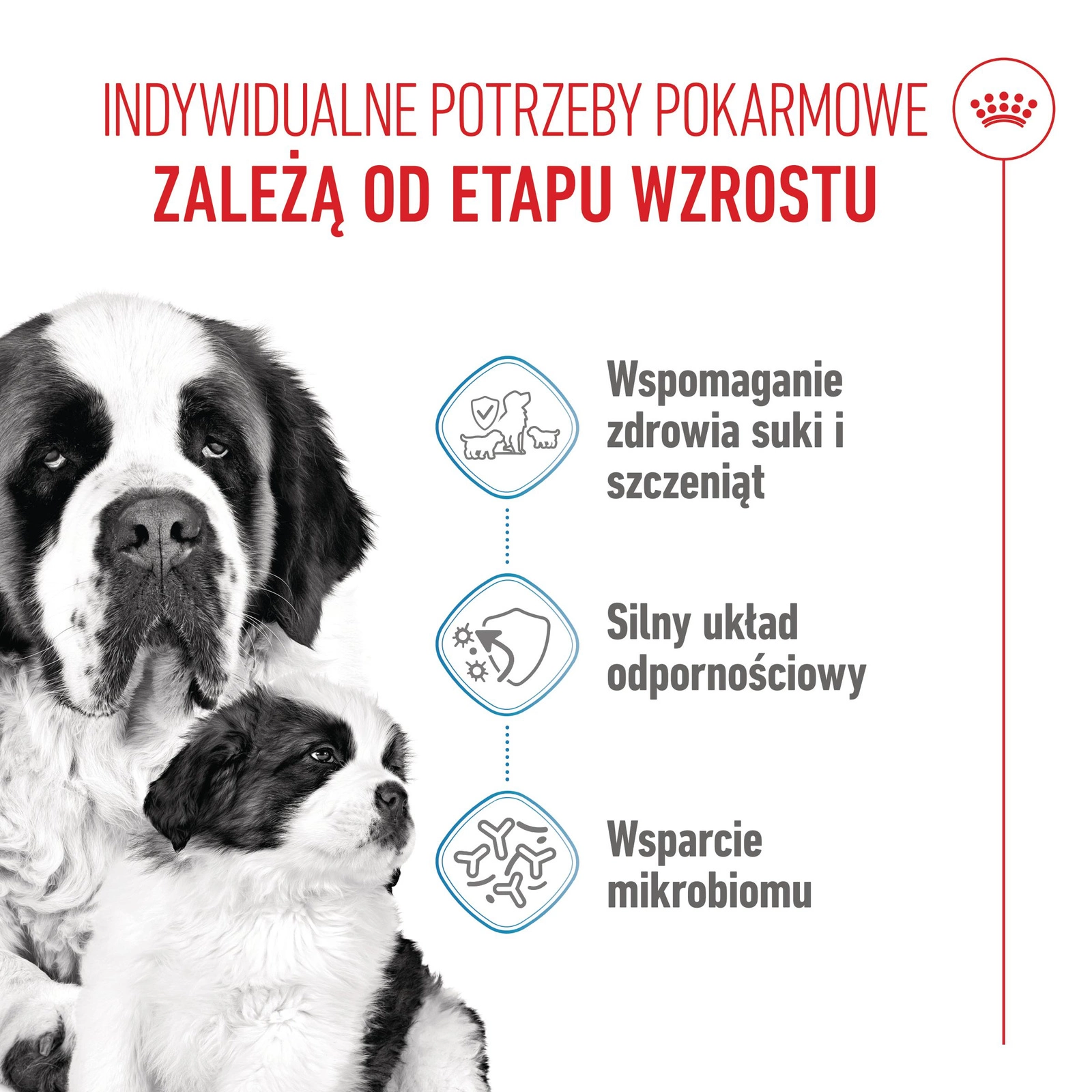 U psów ras olbrzymich mioty są często bardzo liczne, nawet ponad 10 szczeniąt, co jest dużym wyzwaniem dla organizmu suki. Receptura karmy została opracowana w celu pokrycia wysokich potrzeb energetycznych suk ras olbrzymich w drugim etapie ciąży i podczas laktacji. Karma wspomaga również prawidłowy rozwój szczeniąt w okresie odsadzania.