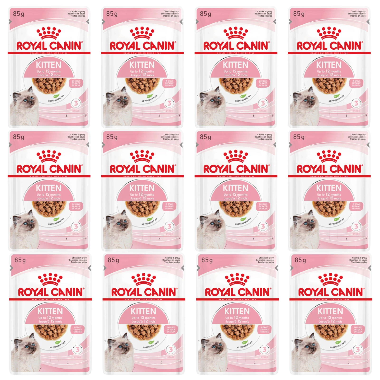 Karma mokra ROYAL CANIN® Kitten w sosie została opracowana specjalnie w celu pokrycia potrzeb pokarmowych kociąt w drugim etapie wzrostu. Receptura jest odpowiednia dla kociąt w wieku 4-12 miesięcy, w okresie znacznych zmian fizycznych i behawioralnych.
