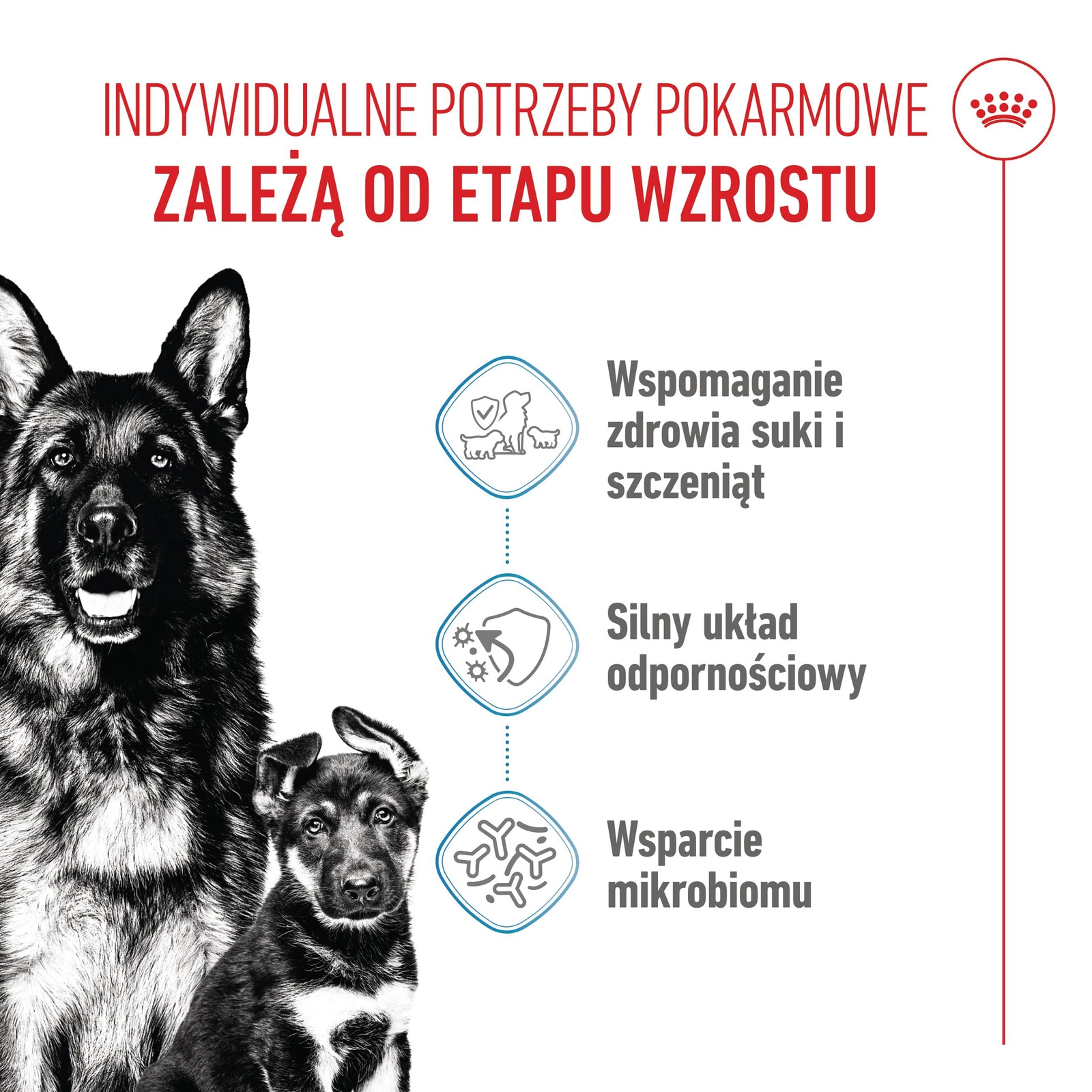 U psów ras dużych mioty są często bardzo liczne, nawet ponad 10 szczeniąt, co jest dużym wyzwaniem dla organizmu suki. Receptura karmy została opracowana w celu pokrycia wysokich potrzeb energetycznych suk ras dużych w drugim etapie ciąży i podczas laktacji. Karma wspomaga również prawidłowy rozwój szczeniąt w okresie odsadzania.