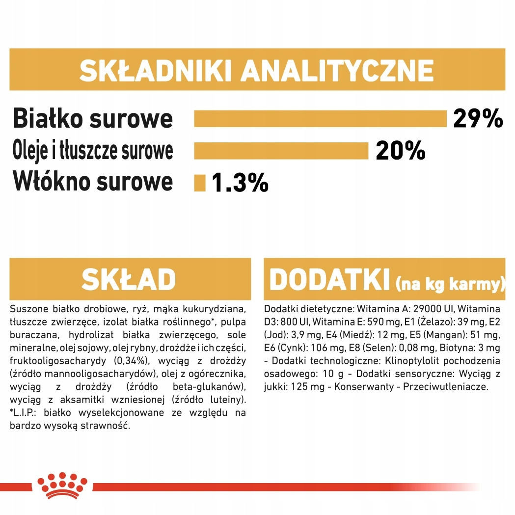 suszone białko drobiowe, ryż, mąka kukurydziana, tłuszcze zwierzęce, izolat białka roślinnego*, pulpa buraczana, hydrolizat białka zwierzęcego, sole mineralne, olej sojowy, olej rybny, drożdże i ich części, fruktooligosacharydy (0,34%), wyciąg z drożdży (źródło mannooligosacharydów), olej z ogórecznika, wyciąg z drożdży (źródło beta-glukanów), wyciąg z aksamitki wzniesionej (źródło luteiny).