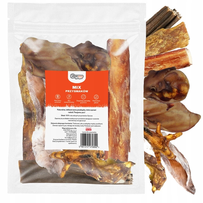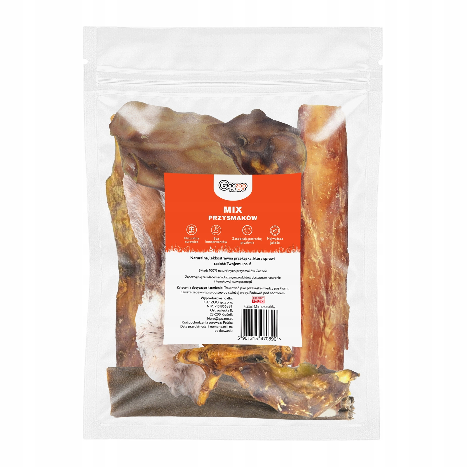 ⭐️ Gaczoo Mix Przysmaków to wyjątkowa kompozycja naturalnych gryzaków, która zaspokoi podniebienia nawet najbardziej wymagających psów. W jednym opakowaniu znajdziesz różnorodne smakołyki o różnych kształtach, strukturach i smakach, dzięki czemu Twój pupil nigdy się nie znudzi. To idealny sposób na urozmaicenie diety i codziennych nagród.