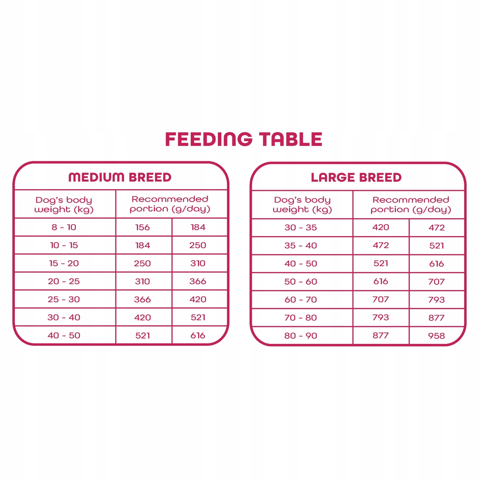- Dawkowanie: ilość karmy należy dostosować do masy ciała, wieku, poziomu aktywności oraz indywidualnych potrzeb psa. Warto kierować się tabelą żywienia podaną na opakowaniu produktu.
