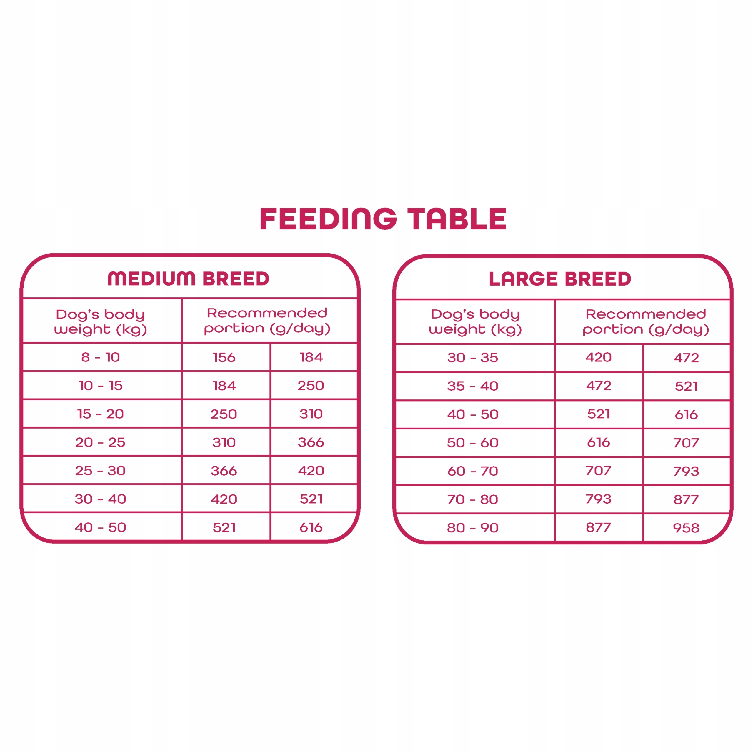- Dawkowanie: ilość karmy należy dostosować do masy ciała, wieku, poziomu aktywności oraz indywidualnych potrzeb psa. Warto kierować się tabelą żywienia podaną na opakowaniu produktu.