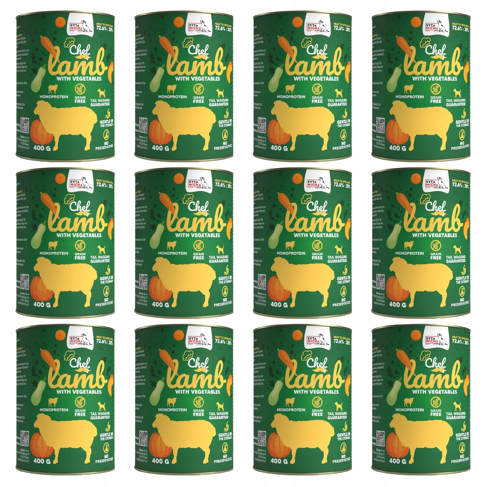 W linii Chef od Sytej Michy znajduje się aż 92,6% produktów pochodzenia zwierzęcego, w stosunku 72.6% mięsa mięśniowego z jagnięcina do 20% jagnięcych podrobów (10% żołądki, 5% serca, 5% wątróbka).