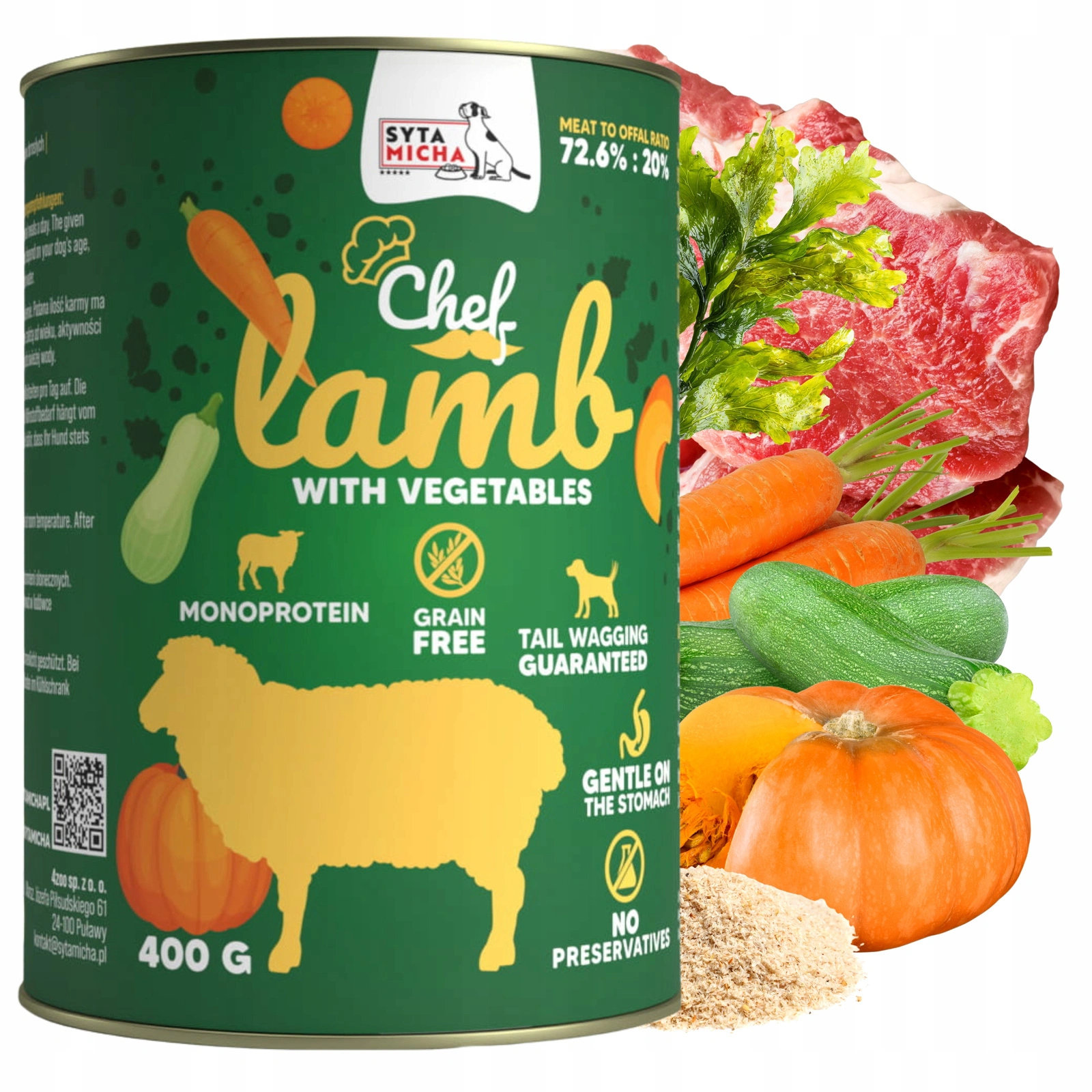 W karmie znajdują się dynia, marchew i cukinia, które dostarczają błonnika, witamin i minerałów, wspierających trawienie, odporność oraz ogólne zdrowie organizmu.