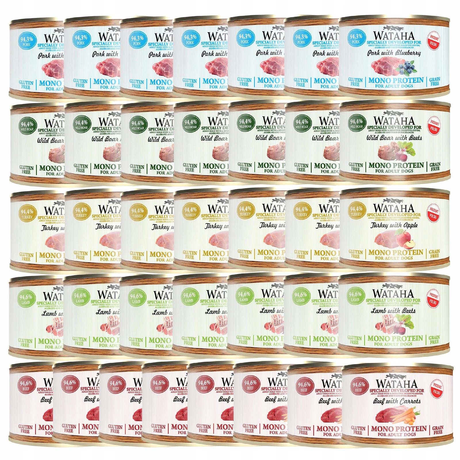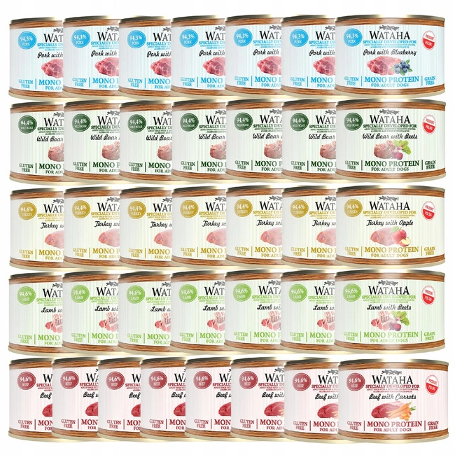 WATAHA Mono Protein Adult to pełnoporcjowa mokra karma dla dorosłych psów, dostępna w zestawie różnych smaków. Każda puszka zawiera tylko jedno źródło białka zwierzęcego, co czyni karmę idealną dla psów z wrażliwym układem pokarmowym lub skłonnościami do alergii.