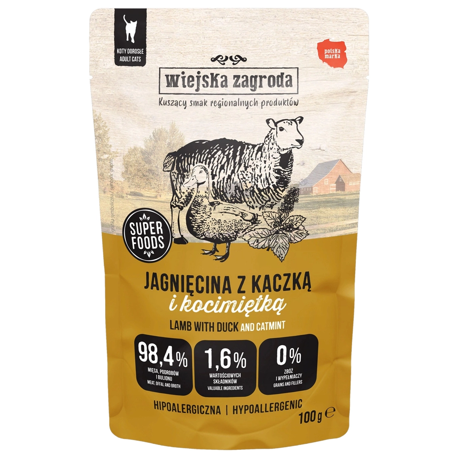 Wiejska Zagroda Jagnięcina z Kaczką i Kocimiętką to pełnoporcjowa, bezzbożowa mokra karma w formie delikatnego pasztetu, stworzona specjalnie dla dorosłych kotów. Połączenie wysokiej jakości jagnięciny i kaczki z dodatkiem kocimiętki sprawia, że posiłek jest nie tylko smaczny, ale również wspiera zdrowie i witalność kota.