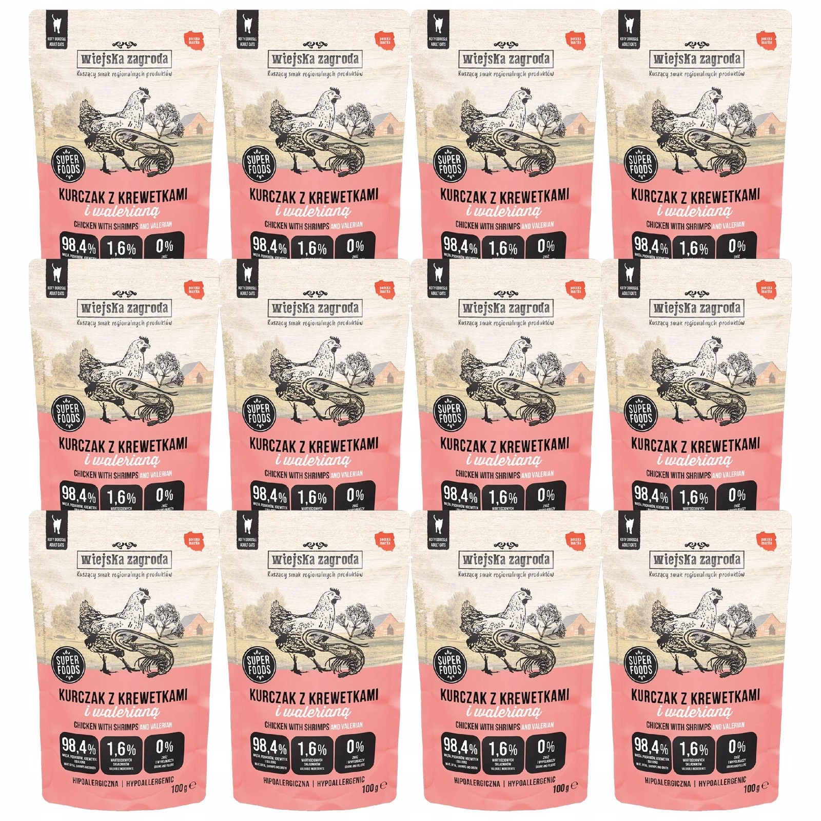 Wiejska Zagroda Kurczak z Krewetkami i Walerianą to pełnoporcjowa, bezzbożowa mokra karma w formie delikatnego pasztetu, stworzona specjalnie dla dorosłych kotów. Połączenie wysokiej jakości mięsa z kurczaka i krewetek z dodatkiem waleriany sprawia, że posiłek jest nie tylko smakowity, ale również wspiera zdrowie i dobre samopoczucie kota.