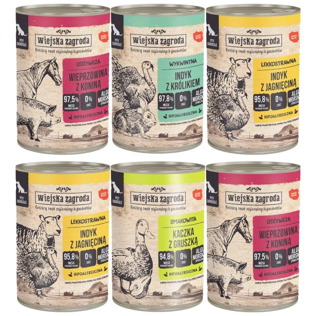 WIEJSKA ZAGRODA Mix Smaków karma dla psa mokra puszka 6 x 400g bezzbożowa