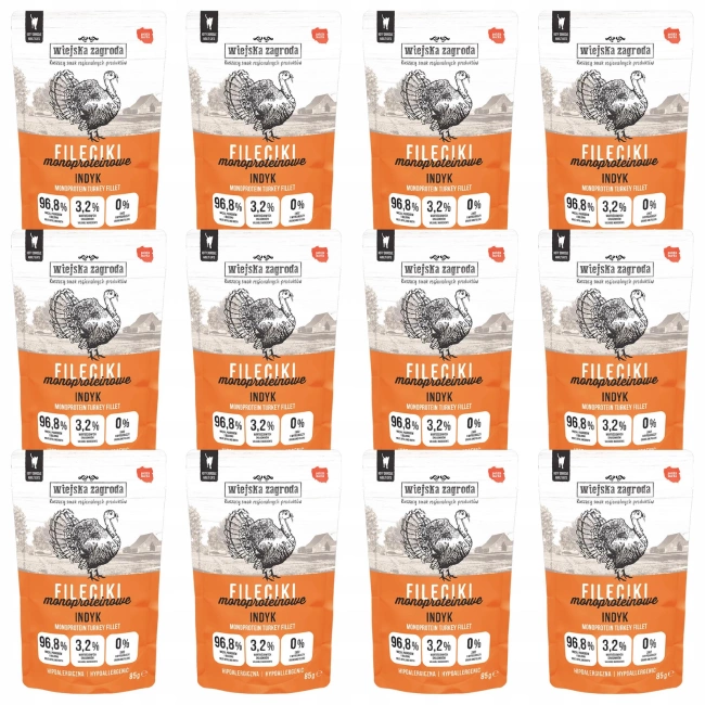 Wiejska Zagroda Mono Fileciki Indyk to pełnoporcjowa mokra karma monobiałkowa w formie delikatnych filecików, stworzona specjalnie dla dorosłych kotów. Formuła oparta na jednym źródle białka zwierzęcego – indyku – jest idealna dla kotów z wrażliwym układem pokarmowym lub skłonnościami do alergii.