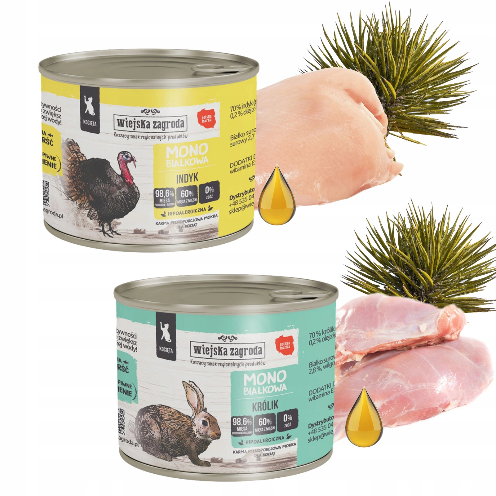 Poznajcie monoproteinowe karmy mokre Wiejska Zagroda dla kota. Każda puszka zawiera jeden rodzaj mięsa, które plasuje się na pierwszym miejscu każdego składu. Karmy stanowią świetny wybór dla wybrednych pupili. Podając naprzemiennie różne źródła białek obserwujemy, którymi najchętniej zajada się nasz Czworonożny Przyjaciel. Idealnie sprawdzą się dla wrażliwych mruczków oraz tych, które zmagają się z alergiami pokarmowymi – podawanie kotu karmy tylko z jednym, określonym typem białka pozwala na obserwacje jego zachowania oraz kondycji skóry.