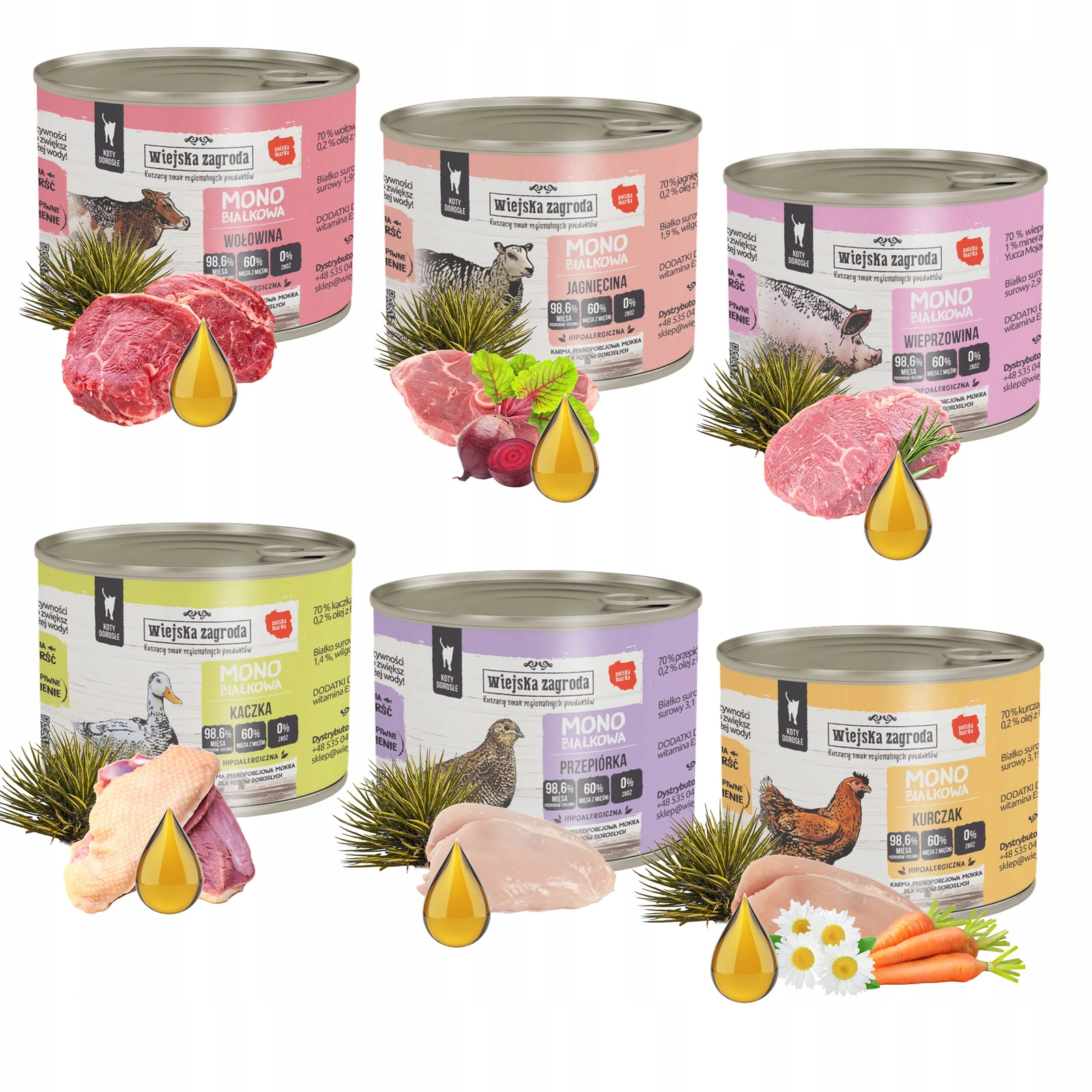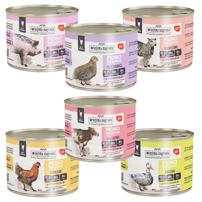 Poznajcie monoproteinowe karmy mokre Wiejska Zagroda dla kota. Każda puszka zawiera jeden rodzaj mięsa, które plasuje się na pierwszym miejscu każdego składu. Karmy stanowią świetny wybór dla wybrednych pupili. Podając naprzemiennie różne źródła białek obserwujemy, którymi najchętniej zajada się nasz Czworonożny Przyjaciel.  Idealnie sprawdzą się dla wrażliwych mruczków oraz tych, które zmagają się z alergiami pokarmowymi – podawanie kotu karmy tylko z jednym, określonym typem białka pozwala na obserwacje jego zachowania oraz kondycji skóry.