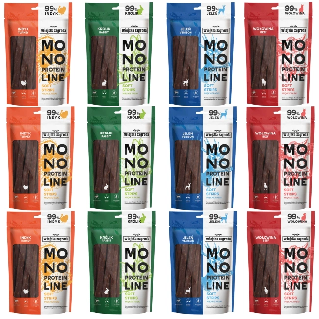 WIEJSKA ZAGRODA MONOPROTEIN paski przysmak smakołyk dla psa mix smaków 12 x 100g