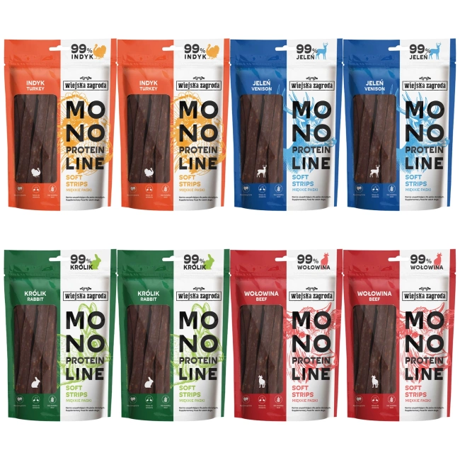 WIEJSKA ZAGRODA MONOPROTEIN paski przysmak smakołyk dla psa mix smaków 8 x 100g