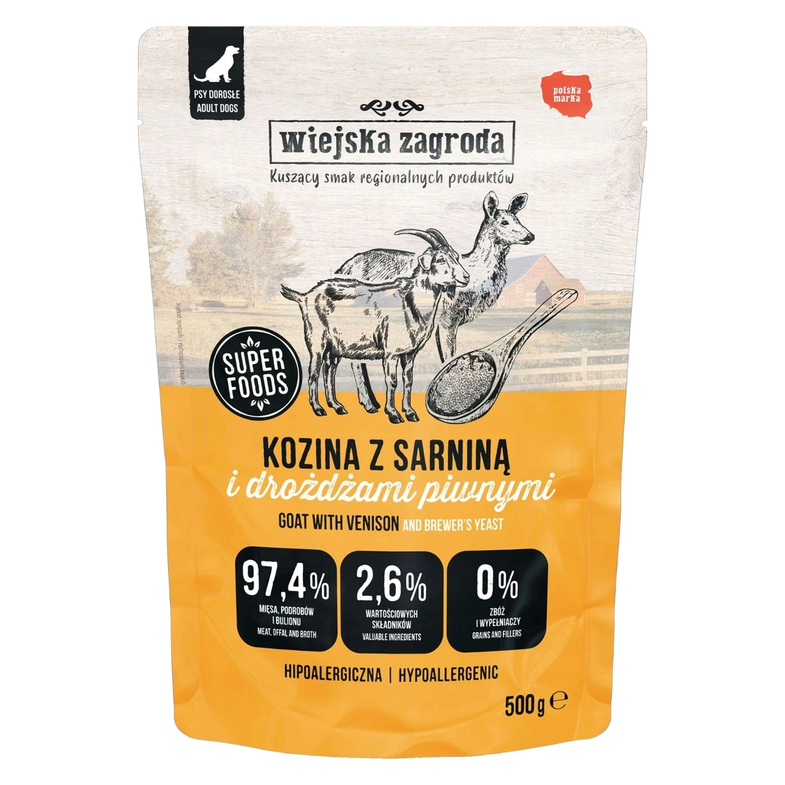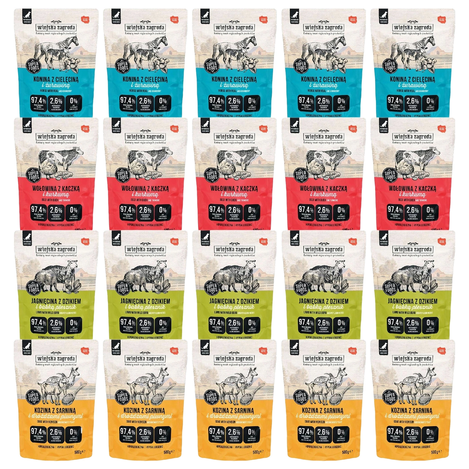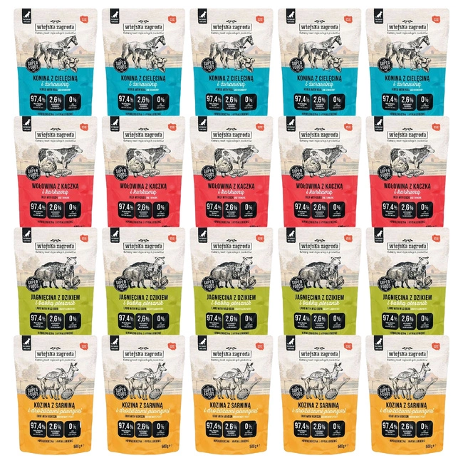 WIEJSKA ZAGRODA pełnoporcjowa mokra karma dla psa w saszetkach 500 g to różnorodny zestaw smaków, który urozmaica codzienną dietę pupila. Każdy wariant bazuje na wysokiej zawartości mięsa i naturalnych składnikach, dostarczając psu wszystkich niezbędnych wartości odżywczych. To zdrowa, smakowita i wygodna w podawaniu propozycja dla psów wszystkich ras.