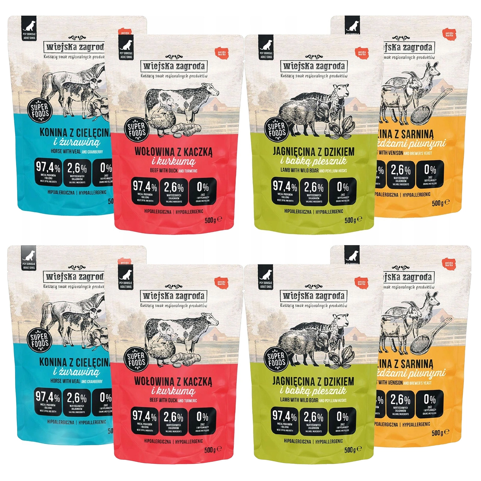WIEJSKA ZAGRODA pełnoporcjowa mokra karma dla psa w saszetkach 500 g to różnorodny zestaw smaków, który urozmaica codzienną dietę pupila. Każdy wariant bazuje na wysokiej zawartości mięsa i naturalnych składnikach, dostarczając psu wszystkich niezbędnych wartości odżywczych. To zdrowa, smakowita i wygodna w podawaniu propozycja dla psów wszystkich ras.